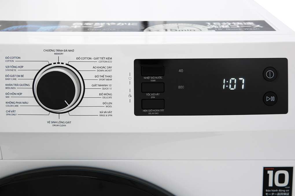 Máy giặt Toshiba Inverter 8.5 Kg TW-BH95S2V WK bao gồm 8 chương trình giặt nổi bật và 8 chương trình giặt khác đáp ứng đa dạng các nhu cầu giặt giũ của bạn: giặt nhanh 15 phút, không phai màu, đồ len, giặt nhanh, đồ mỏng, đồ cotton, giặt tiết kiệm cotton, vệ sinh lồng giặt,... (Xem chi tiết tại bảng thông số kỹ thuật). Đồng thời chế độ giặt nhanh 15 phút còn giúp bạn tiết kiệm được thời gian giặt đồ trong những trường hợp bận rộn mà vẫn giặt nhanh được những bộ đồ ít vết bẩn. Ngoài ra, bảng điều khiển song ngữ Anh - Việt có nút xoay, nút nhấn và màn hình hiển thị rõ ràng, sắc nét giúp bạn dễ dàng thao tác và lựa chọn chương trình giặt phù hợp.